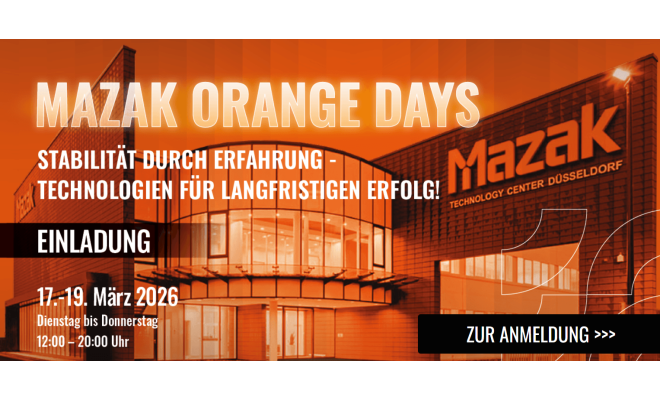 Unser Partner Mazak lädt Sie ein zu den ORANGE DAYS in Düsseldorf! Entdecken Sie vor Ort, wie Mazak Stabilität durch Wissen schafft.