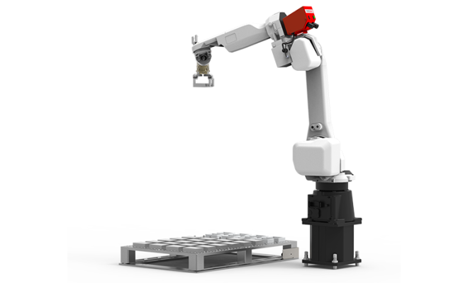 Ein Roboter bietet eine oder mehrere Palettenpositionen an auf denen die Werkstücke positioniert werden. Ein Sicherheitskonzept ist bereits integriert. Die Bedienung erfolgt über einem Industrie-PC.