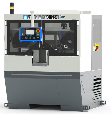 SHARK 230-1 NC HS 5.0, elekrohydraulischer Zweisäulen-Bandsägevollautomat mit halbautomatischer Funktion für Schnitte von 0° von Baustahl, Edelstahl, Stahllegierungen, Voll- und Profilmaterial, mit max. 85 mm Reststücklänge.