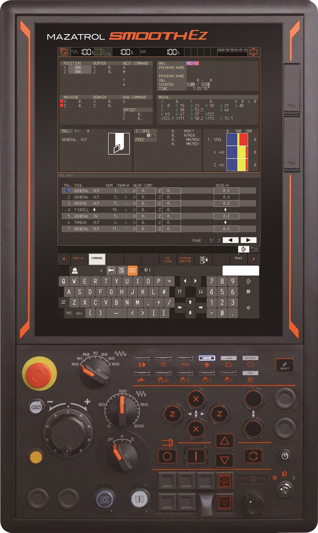 Die SmoothEz ist mit einem 15-Zoll-Touchscreen im Hochformat ausgestattet, der an die Vorlieben des Bedieners angepasst werden kann, sowie mit einer vollständigen QWERTY-Tastatur. Sie bietet Flexibilität, da sie in MAZATROL oder ISO programmiert werden kann.
