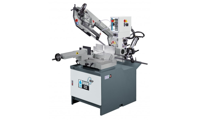 Bandsägemaschine für Schnitte von 45° rechts bis60° links.SHARK 282 CCS(Cut Control System)Funktionsweise: Nachdem man das Materialvorgeschoben hat und der Schraubstock geschlossenhat, wird der Schnittvorgang im gange gesetzt. DieAbsenkung erfolgt durch das Eigengewicht, wirddurch eine Feder ausgeglichen und durch einenhydraulischen Bremszylinder reguliert. Wenn derSchnitt ausgeführt ist, wird der Sägearm von Handbis zu der notwendigen Position für die Zuführung desMaterials hochgedrückt.