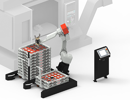 Hochflexibles, kompaktes Automatisierungssystem, das speziell für das Beladen und Entladen von mittleren bis großen Serien von Frästeilen entwickelt wurde. Das Rohmaterial wird auf dem einem Rack angeliefert; die fertigen Werkstücke werden auf dem anderen Rack abgelegt. Die Racks können aufeinander gestapelt werden.