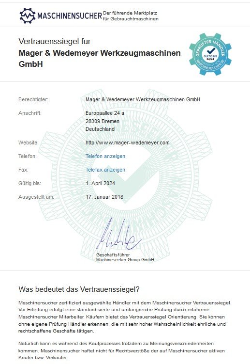 Mit dem Vertrauenssiegel des Onlineportals www.maschinensucher.de können Käufer ohne aufwändige Vorabprüfungen den Kreis der potentiellen Geschäftspartner einschränken und Firmen favorisieren, die mit hoher Wahrscheinlichkeit ehrliche und rechtschaffene Geschäfte machen.
